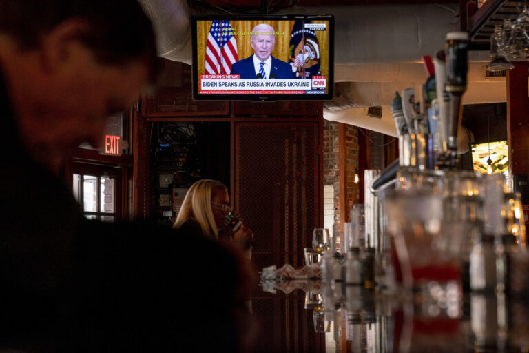 President Joe Biden speaks about Russia's invasion of Ukraine on a television at Shaws Tavern in Washington, Thursday, Feb