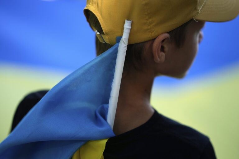 A boy carries a Ukrainian flag tucked in his shirt during a demonstration to mark Ukraine's Independence Day in Lisbon, Sunday, Aug