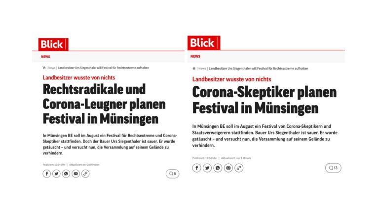 Die erste Schlagzeile des Blicks sprach sogar von Rechtsradikalen – ohne dies zu belegen. Der Titel wurde wenig später in «Corona-Skeptiker» geändert.