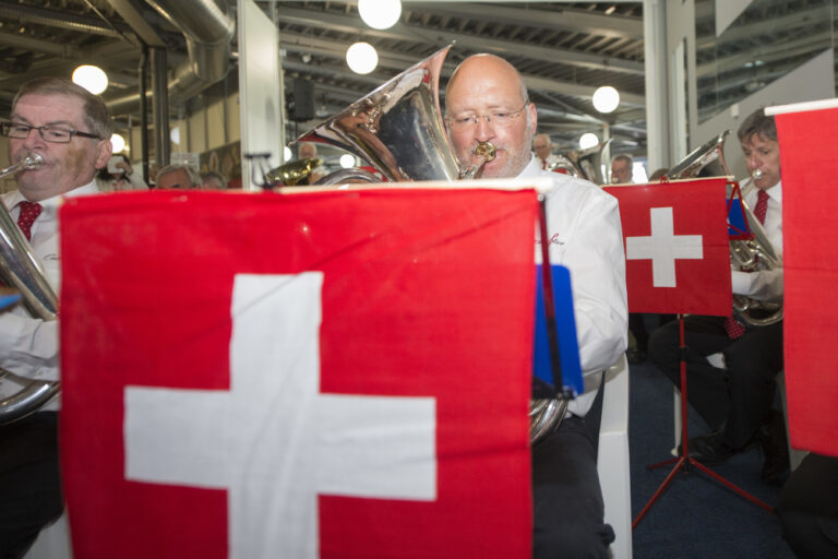 Zu Beginn der Veranstaltung spielt eine Blasmusik mit Schweizer Flaggen bestueckten Notenstaendern anlaesslich der ordentlichen Mitgliederversammlung der AUNS vom Samstag, 23