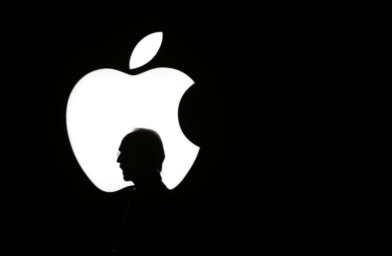 A man is silhouetted walking past the Apple logo during a product display for Apple TV following an Apple event Wednesday, Sept