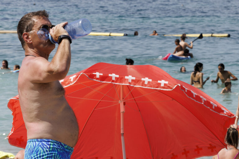 Joel drinks water on the Baby plage on the bank of the Geneva lake, in ...