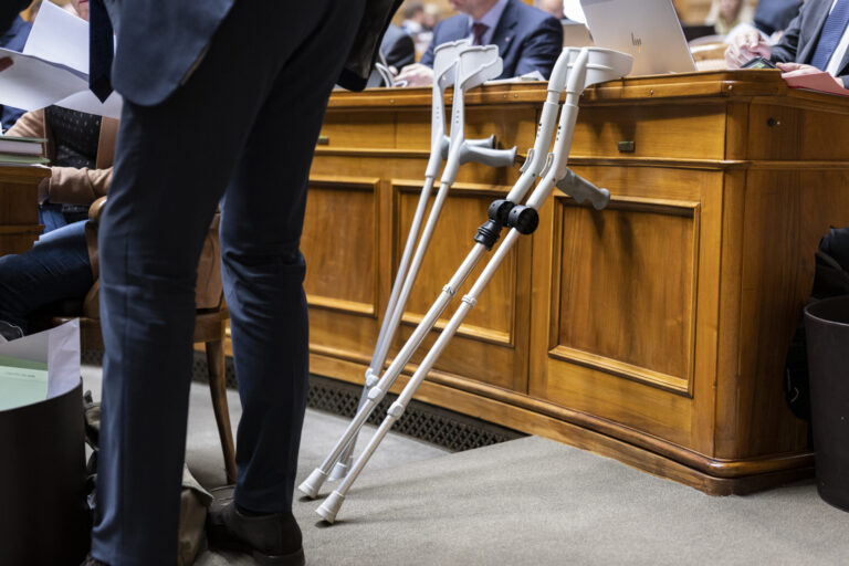 Zwei Paar Kruecken stehen zwischen den Sitzreihen, am ersten Tag der Fruehlingssession der Eidgenoessischen Raete, am Montag, 28