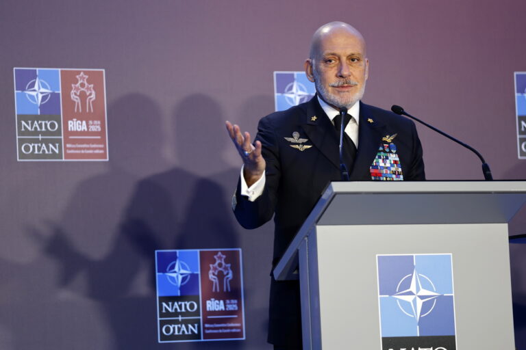 epa12410468 Chair of the North Atlantic Treaty Organization (NATO) Military Committee, Admiral Giuseppe Cavo Dragone, attends a press conference at the end of the NATO Military Committee Conference in Riga, Latvia, 27 September 2025