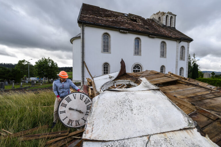 Maurice Bianchi, responsable de la creche aux 5 sens, constate les degats et decouvre le cadran du clocher du Temple des eplatures, un jour apres le passage de la forte tempete le mardi 25 juillet 2023 au Cret-du-Locle a cote de La Chaux-de-Fonds