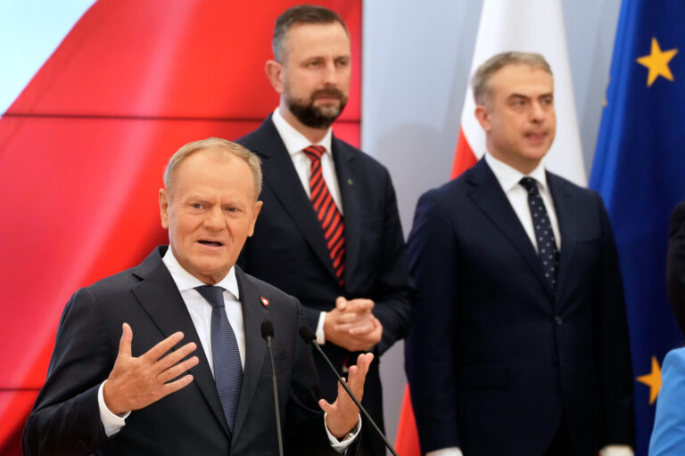Poland's Prime Minister Donald Tusk , left, speaks during a press conference announcing changes in his government in Warsaw, Poland, Wednesday, July 23, 2025