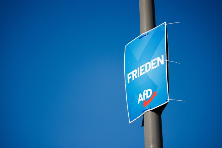 epa11547867 A campaigning poster of the far-right Alternative for Germany (AfD) party, reading 'peace' hangs on a light post in front of the railway station in Dresden, Germany, 13 August 2024