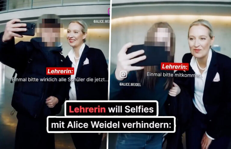 Der kurze Ausschnitt zeigt die 45-Jährige mit einer Gruppe von Schülern im Bundestag, die alle nacheinander ein Selfie mit der Spitzenkandidatin der AfD ergattern wollen, während ihre leicht aufgebrachte Lehrerin im Hintergrund versucht, dem Treiben Einhalt zu gebieten und die Schüler zum Weitergehen zu animieren.