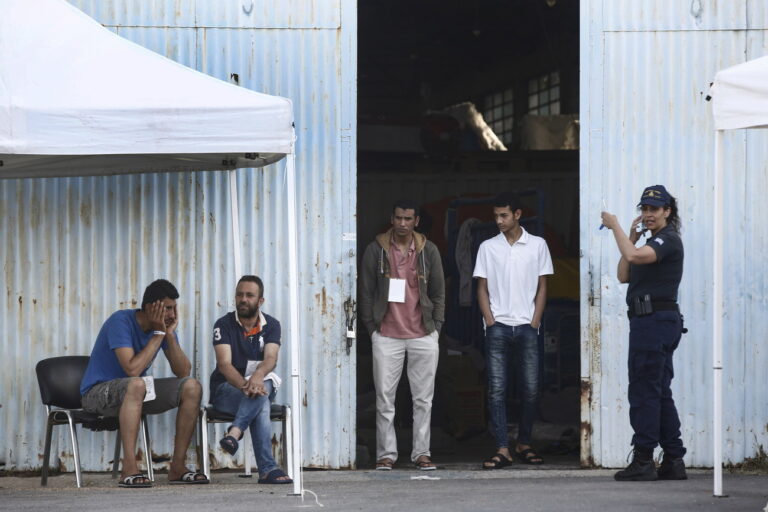 epa10691784 Refugees and migrants stand and sit outside a warehouse where they are treated following a deadly shipwreck off Pylos, at the port of Kalamata, southwest of Athens, Greece, 15 June 2023