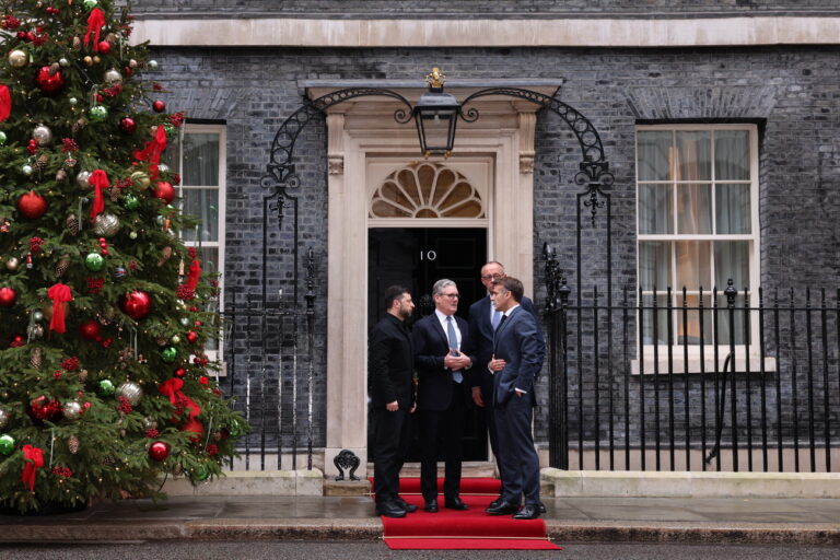 epa12578650 (L-R) Ukraine's President Volodymyr Zelensky, Britain's Prime Minister Keir Starmer, Germany's Chancellor Friedrich Merz and France's President Emmanuel Macron chat on the dootstep of 10 Downing Street after a meeting in London, Britain, 08 December 2025