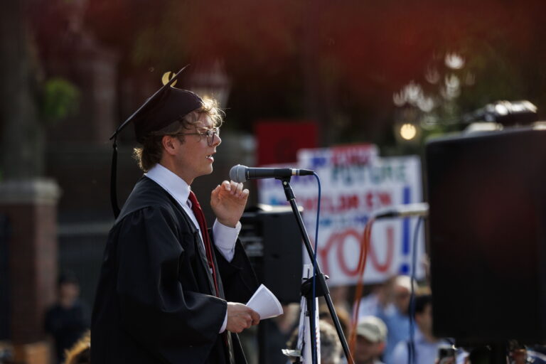 epa12139593 Leo Gerden, a graduating Harvard student from Sweden, addresses a crowd during a rally in support of the international student population at Harvard and other US Universities, outside the Science Center on the Harvard University campus in Cambridge, Massachusetts, USA, 27 May 2025