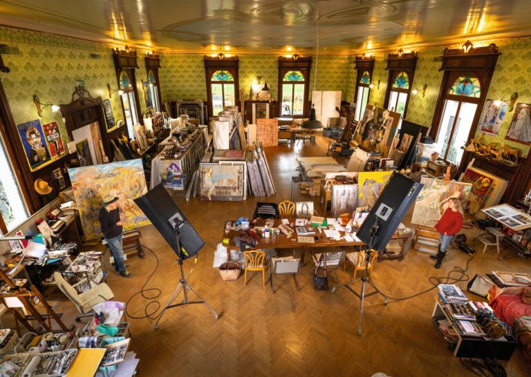 Ich stehe mit meiner Leica im Tanzsaal des Hotels «Kreuz», wo die Jugend des Luzerner Bauerndorfs Meggen die ersten Tanzschritte wagte und die ersten Zungenküsse austauschte. Vollgestopft mit Bildern, überfüllt mit Hunderten dickbäuchigen Kunstbüchern. Staffeleien, halb vollgepinselte Leinwände, unvollständige da Vincis, angefangene Picassos, Warhols aus der Zeit der Serigrafien, dutzendweise Pinsel und Farbtuben. Und Tierbilder überall. Auf den wenigen freien Tischflächen stehen Weingläser mit fein ziselierten Jugendstil-Verzierungen. Offene CDs mit Steppenwolfs «Magic Carpet Ride» liegen unter «Smoke on the Water» von Deep Purple. Ein Atelier wie aus einem Hollywood-Filmse ...