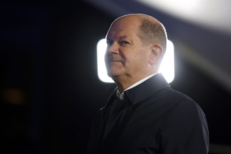 epa10973691 German Chancellor Olaf Scholz waits to receive his guests at the chancellery in Berlin, Germany, 13 November 20 ...