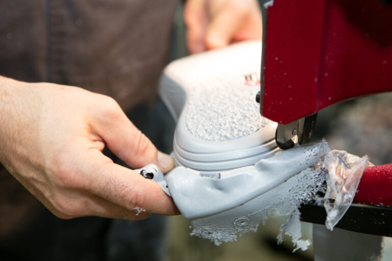 Wenn die Sohlen aus der Maschine kommen, werden sie zunächst getrocknet und anschliessend von überschüssigem Material an den Rändern befreit. Dann unterzieht sie ein Mitarbeiter einem Härtetest. «Von jedem Produktionslos werden stichprobenartig einige Sohlen maschinell bis zu tausendfach belastet», sagt Markus Bartholet, Leiter Produktion. Anschliessend werden Sohle und Schaft zusammengefügt, wobei wasserbasierter Leim zur Anwendung kommt. Besteht der Schaft aus Leder, kommt dieses aus einer Produktion, bei der mit möglichst wenig Wasser gegerbt wird. Anschliessend wird der Oberschuh mit der Sohle verklebt, im Fachjargon sagt man «verheiratet». Die Qualitätskontrolle eines jeden Schuhs schliesst den Herstellungsprozess ab, ehe sie paarweise und mit einer Infobroschüre mit Pflegehinweisen in Schachteln verpackt werden und ins Lager kommen. Seit einigen Monaten werden in Sennwald auch die Schuhe der Berner Oberländer Marke Kandahar gefertigt, welche die Kybun-Joya-Gruppe 2022 übernommen und wohl vor dem Verkauf ins Ausland gerettet hat.