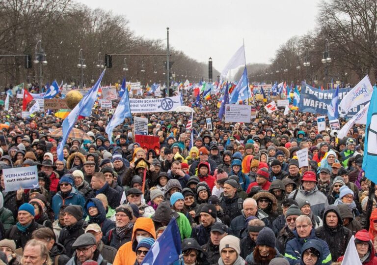 Trotz Schneeregen und eisigen Temperaturen sind am 25. Februar 2023 50 000 Personen aus ganz Deutschland vor dem Brandenburger Tor zusammengekommen, um für den Frieden zu demonstrieren. Sie folgten dem Aufruf der Publizistin Alice Schwarzer und der Linken-Politikerin Sahra Wagenknecht, den Initiantinnen des Friedensmanifests, das innert kürzester Zeit 600 000-mal unterschrieben wurde.