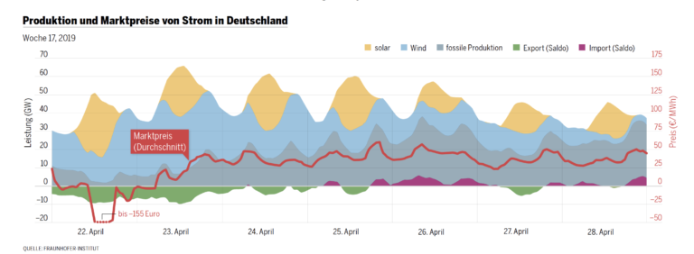 Das Fraunhofer-Institut für Solare Energiesysteme (ISE) verkündete die frohe Botschaft auf Twitter: Neuer Rekord! Am Ostermontag hatten die neuen erneuerbaren Energien (NEE) einen Anteil von 77 Prozent an der öffentlichen Nettostromerzeugung! Auch der Spiegel feierte den 22. April 2019 als Datum, an dem die grüne Welt fast Realität geworden sei: «An diesem Tag schien die Sonne von morgens bis abends, der Wind trieb die Windmühlen im ganzen Land zur vollen Leistung. [. . .] Es war ein Zauber, das perfekte Zusammenspiel aus Natur und moderner Technik. Leider hielt er nur für diesen einen Tag.»