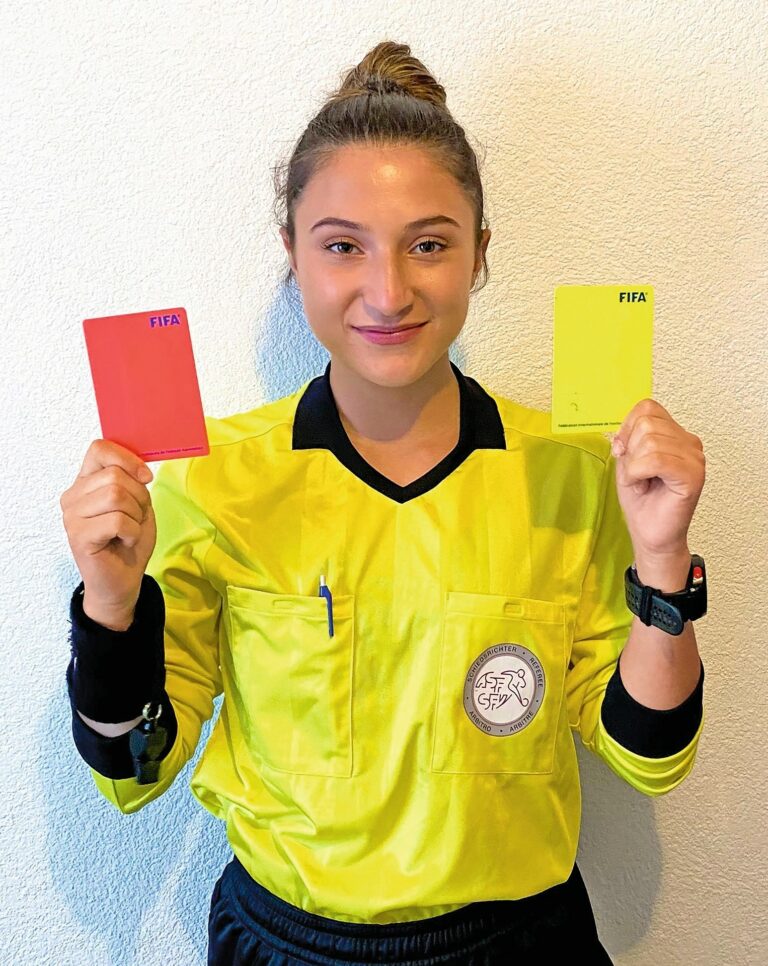 Letztes Jahr schloss ich meine KV-Lehre ab. Nun arbeite ich als Sachbearbeiterin, daneben bin ich Schiedsrichterin. Am Samstag und Sonntag pfeife ich immer, manchmal auch am Mittwoch. Meine Qualifikation reicht bis in die 3. Liga und als Assistentin in die 2. Liga interregional. Bei den Frauen leite ich Spiele bis in die Nationalliga B. Es ist cool, die Autoritätsperson zu sein. Und mir gefällt es, wenn mir nach dem Match gesagt wird, ich hätte meinen Job gut gemacht. Als Frau will ich zeigen, dass auch wir Männerspiele pfeifen können.