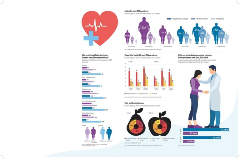 Wie gesund oder krank sind wir? Essen die Schweizerinnen und Schweizer täglich Obst oder Gemüse? Wie steht es um den Alkoholkonsum? Raucht die Jugend weniger als früher? Ist die Bevölkerung ausreichend körperlich aktiv? Gibt es Unterschiede im Gesundheitsverhalten zwischen den Geschlechtern, zwischen Ausländern und Schweizern? Dumm und dick ...