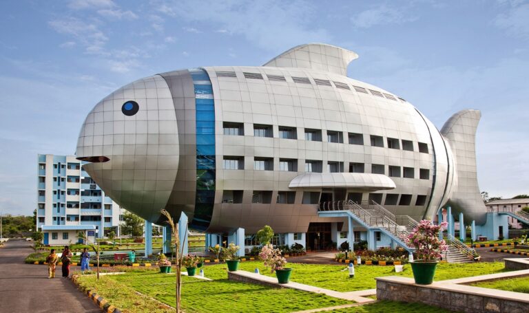 Der ziemlich grosse Büro-Komplex, der nicht wie ein Haus aussieht, sondern wie ein Fisch, steht in der indischen Zehn-Millionen-Stadt Hyderabad; der nächste Hafen befindet sich ironischerweise rund 300 Kilometer entfernt. Seit der dreistöckige, knapp 2000 Quadratmeter grosse bauliche Sonderling 2012 eröffnet wurde, ist er umstritten. Die einen finden ihn lustig, andere schrecklich. Das amerikanische Magazin Time spottete damals, das «Meeresmonstrum» schaue aus «wie ein Hai, der e ...
