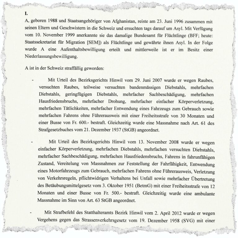 Kriminelle Ausländer sollen des Landes verwiesen werden. So wollte es der Souverän 2010, die Ausschaffungsinitiative verschärfte das Wegweisungsprozedere. Keine Rückweisung widerfuhr einem Afghanen nach über zehnjähriger Delinquenz. Raub, Sozialhilfebetrug, Diebstahl, Sachbeschädigung, Hausfriedensbruch, einfache Körperverletzung, Übertretung des Betäubungsmittelgesetzes, «Drohung gegen den hetero- oder homosexuellen Lebenspartner» – dies ist eine Auswahl der Delikte, die zum Entzug der Niederlassungsbewilligung führten. Trotzdem dürfe er vorläufig bleiben, sagte das Zürcher Verwaltungsgericht. ...