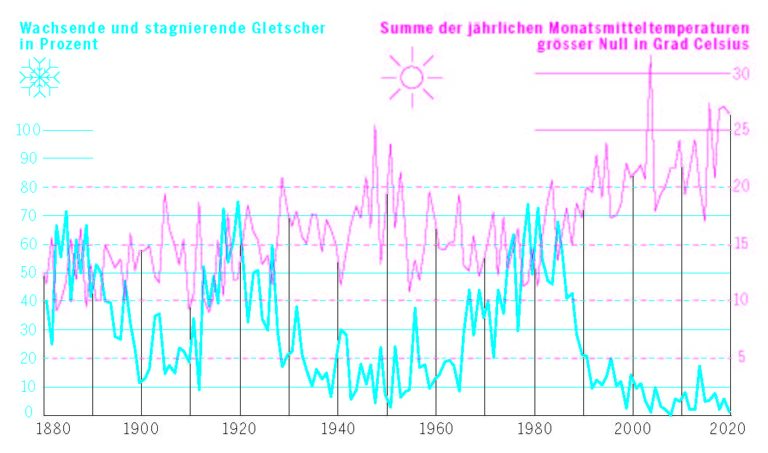 Das Klimagesetz, das am 18. Juni zur Abstimmung gelangt, ist eng mit dem Thema Gletscher verbunden. Die Gesetzesvorlage wurde als indirekter Gegenvorschlag zur Gletscherinitiative entworfen, und die Befürworter argumentieren mit der Behauptung, mit einem Ja könne man praktisch die Gletscher retten. Seit Jahren beklagen Medien, Interessengruppen und Politiker schmelzende Gletscher und belegen das oft mit dramatischen Bildern oder Grafiken. Dass jedoch Gletscher schon in früheren Zeiten massiv schwanden, wird ausgeblendet. Ebenso, dass sie zwischendurch wieder wuchsen und verloren geglaubte Gletscher wieder «auferstehen» können.