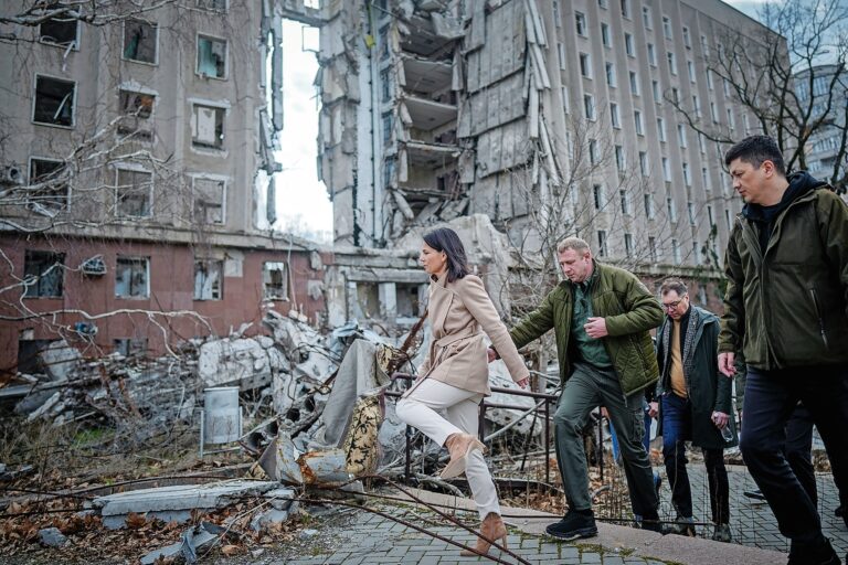 Annalena Baerbock flieht vor einer russischen Drohne – stilvoll auf hohen Absätzen. Sieht so feministische Aussenpolitik aus?