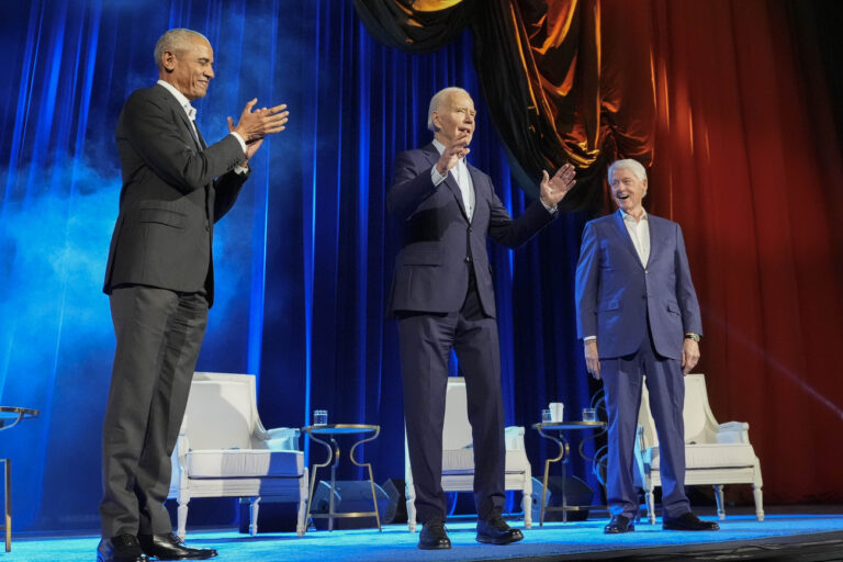 President Joe Biden and former presidents Barack Obama and Bill Clinton participate in a fundraising event at Radio City Music ...