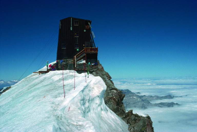 Bis zur Schweizer Grenze ist es nicht einmal ein Steinwurf, die Capanna Regina Margherita steht also nur ganz knapp auf italienischem Boden. Und das seit dem 18. August 1893. Damals übernachtete die italienische Königin Margarethe zur Feier der Eröffnung wohl zum ersten und letzten Mal in ihrem Leben auf 4554 Metern über Meer. Höher ist nur der Himmel. Von der Margheritahütte aus erkennt man im Nordwesten das Matterhorn, die Dufourspitze, der höchste Gipfel der Schweiz, ist zum Greifen nah, und in klaren Nächten sind die Lichter Turins, der viertgrössten italienischen Stadt, zu sehen. Die niedrigste Temperatur, die hier oben gemessen wurde, beträgt minus 41 Grad. Bewartet wir ...
