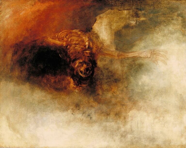 William Turner, Death on a pale horse, ca. 1825 – Er ist der vierte Reiter der Apokalypse, jener auf dem fahlen Pferd, er ist der letzte, jener, der Platz machen soll, für eine neue Welt. Die Reiter vor ihm brachten Eroberungen, Kriege und Hungersnöte. Er, der vierte, bringt die Seuchen, das finale Sterben und den Tod. Johannes berichtet von den letzten Tagen der Welt und des Menschen in seiner Offenbarung.