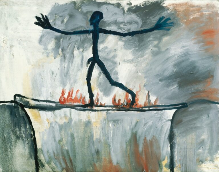 A. R. Penck, Der Übergang, 1963 – Immer wieder wandeln wir fraglos fast durch die von uns geschaffene Welt voller kleiner Wunder und Wahnwitz. Wir produzieren mit jedem Schritt irgendetwas; Waren, Träume, Illusionen, und in regelmässigen Abständen produzieren wir ein Zuviel davon, und wir merken, wie brüchig all unser Geschaffenes ist und wie sumpfig der Boden, auf dem wir alles errichtet haben.