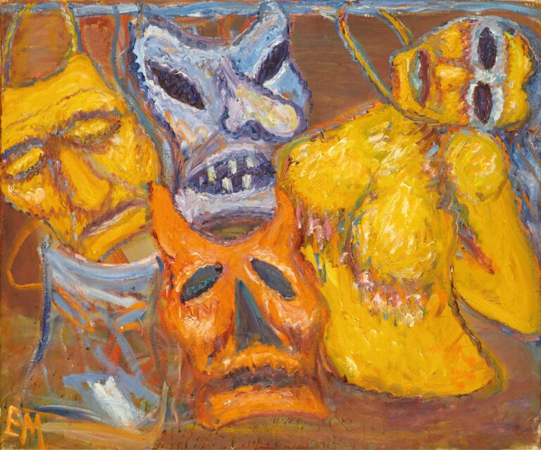 Else Meidner, Masken, um 1960/1962 – Es war, als ob ein Schleier über der Künstlerin und ihrem Werk lag. Und lange der Schatten ihres im Licht stehenden Mannes. Sichtbar nur für wenige, kaum für das grosse Auge der Welt. Der andere Schleier in ihrem Leben war jener universelle, der sich immer wieder über all die Seelen der Welt samt ihrem brodelnden Magma der Melancholia faltet, und den sie immer wieder zu lüften versuchte, um zu sich selbst vorzudringen. Sie war beides: Seelensucherin und Seelenforscherin. Jetzt erst dringt das Licht der Welt d ...