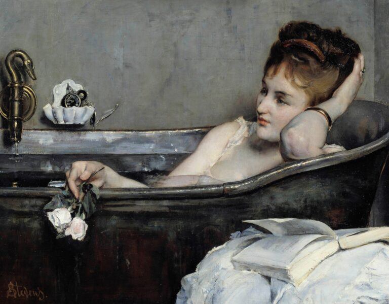 Alfred Stevens, The Bath, 1867 – Eine der Schwierigkeiten des Menschen im gerade vorherrschenden Gesellschaftsmodell eines bröselnden Spätkapitalismus ist, dass das Nervensystem mit der irreführenden Bezeichnung «Sympathikus» über die Massen strapaziert wird, da er Verhaltensweisen wie Kampf, Flucht, Leistung und Fleiss freisetzt.