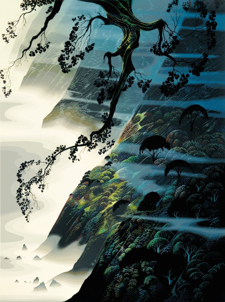 Eyvind Earle, Sea Wind and Fog, 1988 – Dann fiel der Nebel des Schlafes über die Menschen im Schloss, zuerst über die Prinzessin, dann über den König und die Königin, über den Koch auch, den Küchenjungen, über Hunde und Tauben, über alle und alles, was Leben in sich trug und im Schloss war, sogar der Wind stand still. Eine riesige Dornenhecke wuchs um das Schloss, undurchdringlich war sie, hundert Jahre lang.