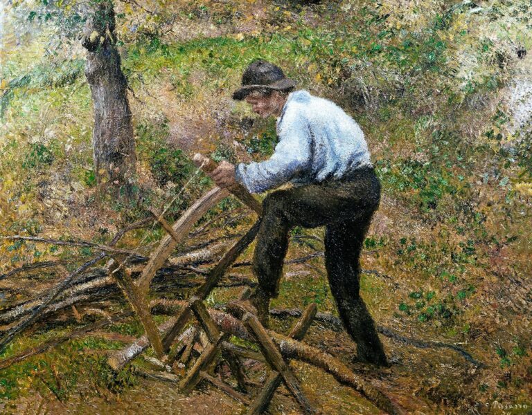 Camille Pissarro, Le père Melon sciant du bois, 1879 – Er lebte ein Leben, das viele nur träumen, in Zeiten, die unseren Tagen vielleicht die Träume zurückbringen würden. Camille Pissarro (1830 –1903) war ein Reisender, ein Unangepasster, ein Anarchist, ein brodelnder Geist im bewegten Magma seiner Epoche, das sich explosiv befreite aus seiner Kammer, und aus dem flüssigen Gestein, das sich über die Felder der Bourgeoisie ergoss und dann zu Erde wurde, spross eine neue Gesellschaftsform; das Proletariat.