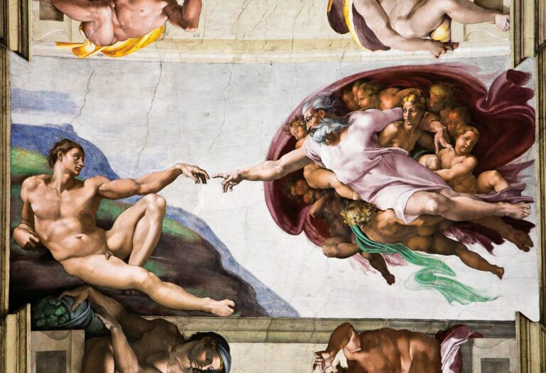 Michelangelo, Die Erschaffung Adams, 1508–1512 – Und so, sagt die grösste Erzählung der Welt, schuf Gott den Menschen nach seinem Ebenbild, und der Mensch war wie ein Kind, das, als es immer mehr über die Welt wusste und sich selbst, Gott als Gott ablöste. Und da ist er nun, der Mensch, im Irgendwo zwischen Himmel und Erde in Sphären, die einst jene Gottes waren.