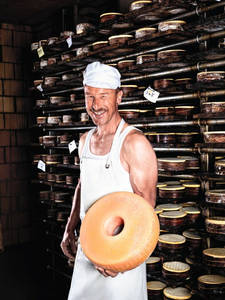 Zwischen zwölf und fünfzehn Kilo wiegt so ein von Molke triefender Käselaib, und er muss fünf-, sechsmal gewendet werden. Zehn Laibe liegen auf einem Tisch, und drei solche Tische stehen in der Halle. Das heisst, dass da an einem halben Vormittag gut zwei Tonnen Masse mit Muskelkraft gestemmt und gewuchtet werden. Was wiederum erklärt, weshalb der Mann mit dem Asterix-Schnurrbart, der gerade wie Miraculix in einem grossen Kessel herumrührt, einen Bizeps hat wie Obelix.