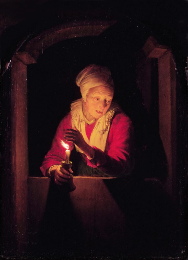 Gerrit Dou, Alte Frau mit Kerze, 1661 _ Kaum noch sieht man in urbanen Ballungsgebieten den Sternenhimmel. Des Menschen Glühbirnen verschlingen die Sicht auf das fast ewige Licht aus dem Irgendwo des Unergründlichen. Nie war die Welt heller und greller als in diesen Tagen und doch viel mehr von Dunkelheit umfangen.