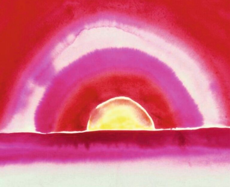 Georgia O’Keeffe, Sonnenaufgang, 1916 – Es gibt kaum etwas Tröstlicheres und Beruhigenderes in dieser unrettbaren und unruhigen Welt als einen Sonnenaufgang. Wenn die Sonne am Horizont ihre Strahlen vorausschickt und das ruhende Dunkel der Nacht verblassen lässt. Wie sie, Stück für Stück getragen von Leichtigkeit, über den Horizont schwebt, in alles dringt und beginnt, eine halbe Welt zu erwärmen und verheissungsvoll einen Tag zu erhellen, der noch nicht durch die Schatten des Lebens verfärbt ist.