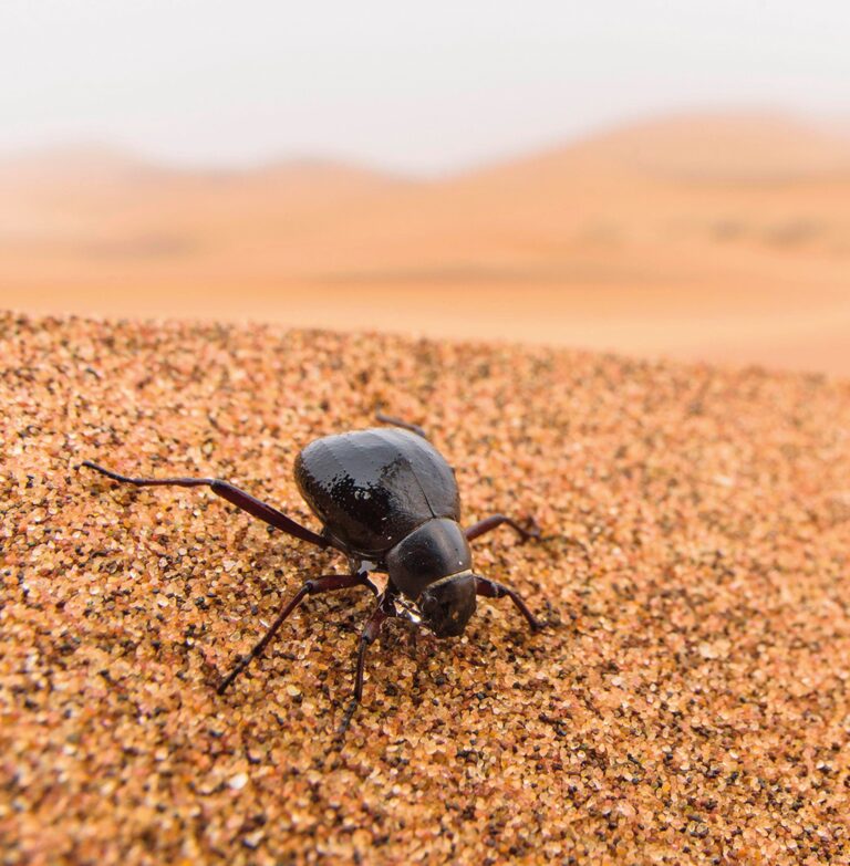 In der Namib entwickelte sich in Jahrmillionen eine Vielzahl hochspezialisierter Pflanzen- und Tierarten, die ausschliesslich hier vorkommen. So etwa zahlreiche Arten von Schwarzkäfern, die sämtliche Tricks gegen Hitze und Trockenheit zu kennen scheinen. Die wohl wichtigste Strategie ist das Sparen. Nur wer die Wasserverdunstung des eigenen Körpers extrem kleinhalten kann, hat eine Chance, der raschen Austrocknung zu entgehen. Der Körper der Käfer ist ein Wunderwerk der Anpassung. Um das Körperinnere vor übermässiger Verdunstung zu schützen, sind die Vorderflügel zu einer harten, geschlossenen Deckschale verwachsen. Damit ein Minimum an Wasser über die ausgeatmete Luft verlorengeht, geschieht der Luftaustausch über einen feuchten Hohlraum unter dem Rückenpanzer mit lediglich einem kleinen Loch zur Aussenwelt.