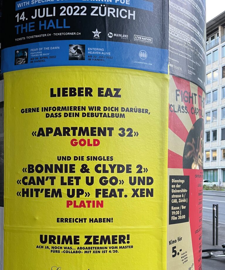 Das Label Universal gratuliert EAZ aus Wetzikon zu Edelmetall. Spotify hat sich zum MTV der Generation Z durchgesetzt und die Hörgewohnheiten des Publikums verändert. Einst ersetzte die Compact Disc die Langspielplatte (welche derzeit ein Comeback feiert), diese wiederum wurde alsbald durch das MP3-File entmaterialisiert. Die Streamingdienste haben in der Folge den Musikmarkt endgültig in die virtuelle Sphäre bugsiert. Der long tail wedelt ...