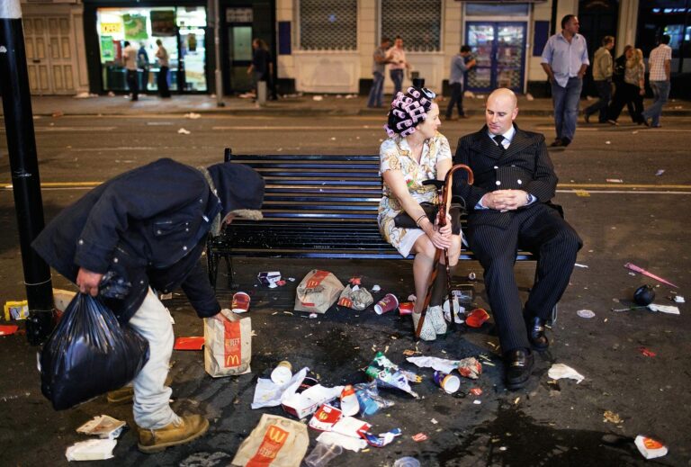 Ein Mann mit abgewandtem Gesicht liegt in der Badehose vor einer Raupenkette. Daneben ein spielendes Kind, das etwas verloren erscheint. Ein trügerisches Kriegsbild oder doch eher eine Freizeitidylle? Im Hintergrund lässt sich jedenfalls ein Blick auf das Meer erhaschen. Der englische Fotograf Martin Parr hat das Bild in den 1980er Jahren im Seebad New Brighton aufgenommen, unweit von Liverpool, wo sich der Fluss Mersey in die Irische See ergiesst.