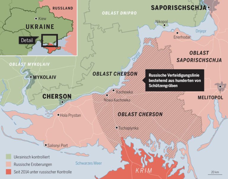 Tawrytschanka Am Südufer des Dnjepr heben Hunderte Soldaten lange und tiefe Schützengräben aus dem rötlich-feuchten Boden. Vor dem Flussbett weht eine verstaubte Russland-Flagge. Ein paar Meter entfernt verstecken sich zwei Scharfschützen hinter einem verlassenen Lieferwagen, der als Barrikade dient. Auf dessen Seite prangt ein grosses «Z». Ab und zu feuern sie aus ihren Kalaschnikows Schüsse auf die Stellungen der ukrainischen Armee am gegenüberliegenden Ufer. Dann rennen sie schnell weg, da die Ukrainer mit Artillerieschüssen antworten könnten. ...
