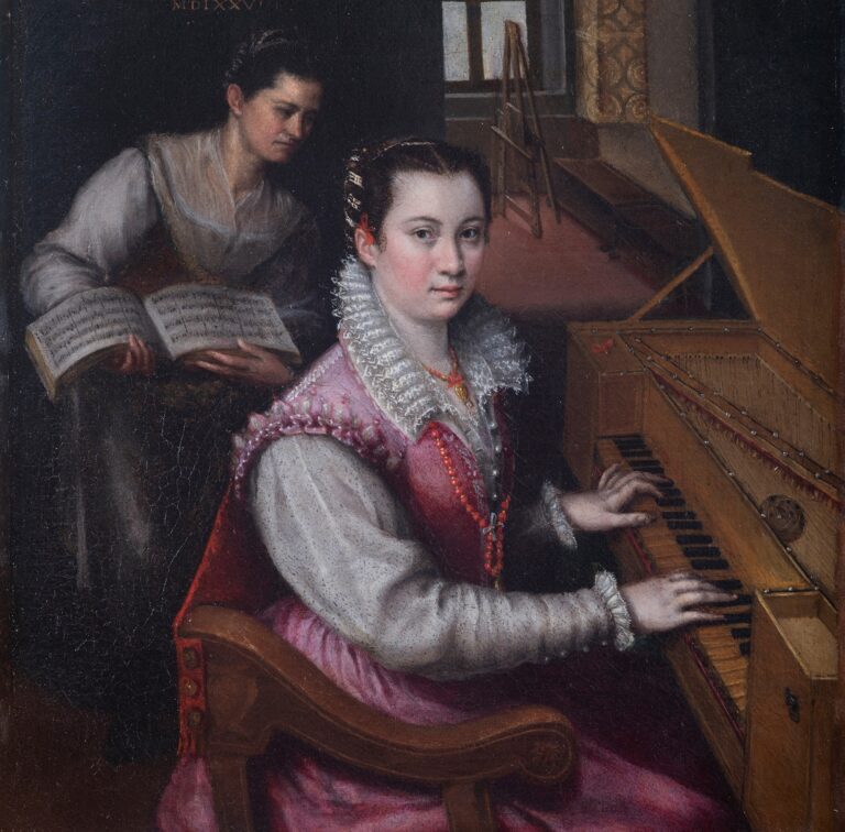 Lavinia Fontana (1552–1614), die Tochter eines Künstlers, warb mit einem Selbstporträt am Spinett für sich als Braut. Sie war 24 Jahre alt. Ihr Vater hatte Verbindungen zu einer wohlhabenden Familie in Imola, deren Sohn Giovanni Paolo Zappi er als Bräutigam gewinnen wollte. Die junge Malerin musste mit diesem Werk nicht diesen von sich überzeugen, sondern dessen reichen Eltern, die eine sichere Zukunft versprachen. Lavinia setzt sich geschickt in Szene, spielt offenkundig blind. Die Noten hält ihre Zofe im Hintergrund vergeblich bereit. Ein roter Liebesknoten auf dem Spinett deutet auf ihre amouröse Absicht hin. Die Heirat kam zustande, die Ehe war aus heutiger Sicht gl ...
