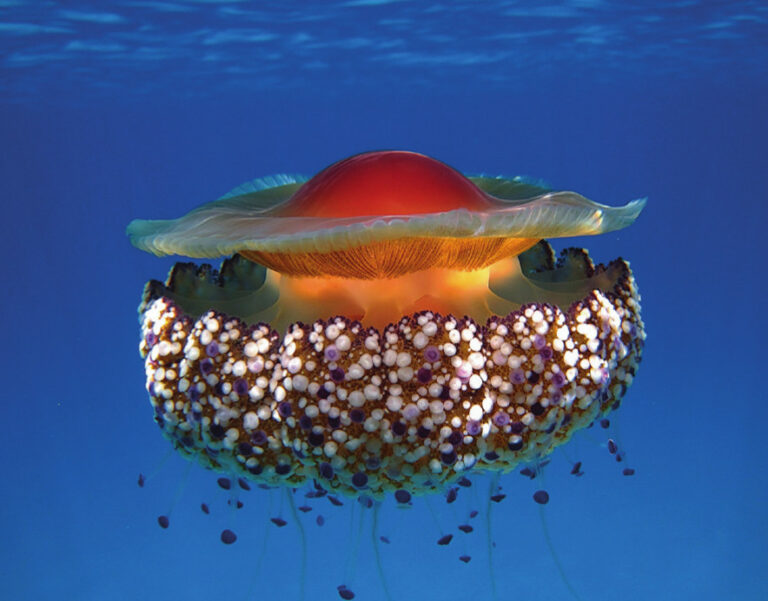 Quallen gehören zu den weniger beliebten Strandgästen. In den warmen Sommermonaten erscheinen sie in Massen an den Badestränden und sorgen für schmerzvolle Ferienerinnerungen. Sie tragen an den kaum sichtbaren, dünnen Fangarmen mikroskopisch kleine Nesselzellen, die schon bei der geringsten Berührung aktiv werden. Innert Millisekunden zischen winzige Harpunen los, verankern sich mit Widerhaken in der Haut des Opfers und spritzen lähmendes Gift in die Wunde. Die Beute wird in die mundartige Öffnung am unteren Körperrand zu den Verdauungszellen an der Innenwand des glockenförmigen Körpers transportiert.