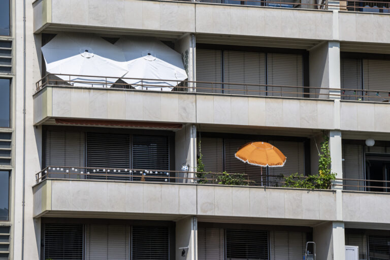 Die Zahl subventionierter Wohnungen in den Städten soll steigen. So wollen es die Stadtbewohner und die Stadtregierungen. Die Stadt Zürich will den Anteil genossenschaftlicher und kommunaler Wohnungen von einem Viertel auf ein Drittel steigern. In Bern ist die Volksinitiative «Für bezahlbare Wohnungen» seit dem 1. Januar 2020 in Kraft. Und in Basel sollen im Rahmen des Wohnbauprogramms 1000+ innert zehn Jahren tausend neue preisgünstige Wohnungen gebaut werden. Une facade d?un immeuble est photographie avec des parasols de jardin et des stores met ...