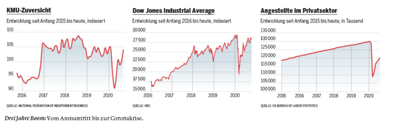 Als Erster fragte Ronald Reagan die Amerikaner: «Geht es Ihnen heute besser als vor vier Jahren?» Seit Reagans siegreichem Wahlkampf gegen Amtsinhaber Jimmy Carter im Jahr 1980 wurde die Antwort auf diese Frage zu einem Standard-Gradmesser für die Wirtschaftspolitik eines Präsidenten. Meinungsforscher ziehen aus ihr auch Rückschlüsse auf die Chancen der Wiederwahl. Mit Blick auf Donald Trump sagen 56 Prozent der Amerikaner: «Ja, es geht mir besser.» Das zeigt die neueste Erhebung des Umfrageinstituts Gallup – Ende September, mitten in der Corona-Rezession.