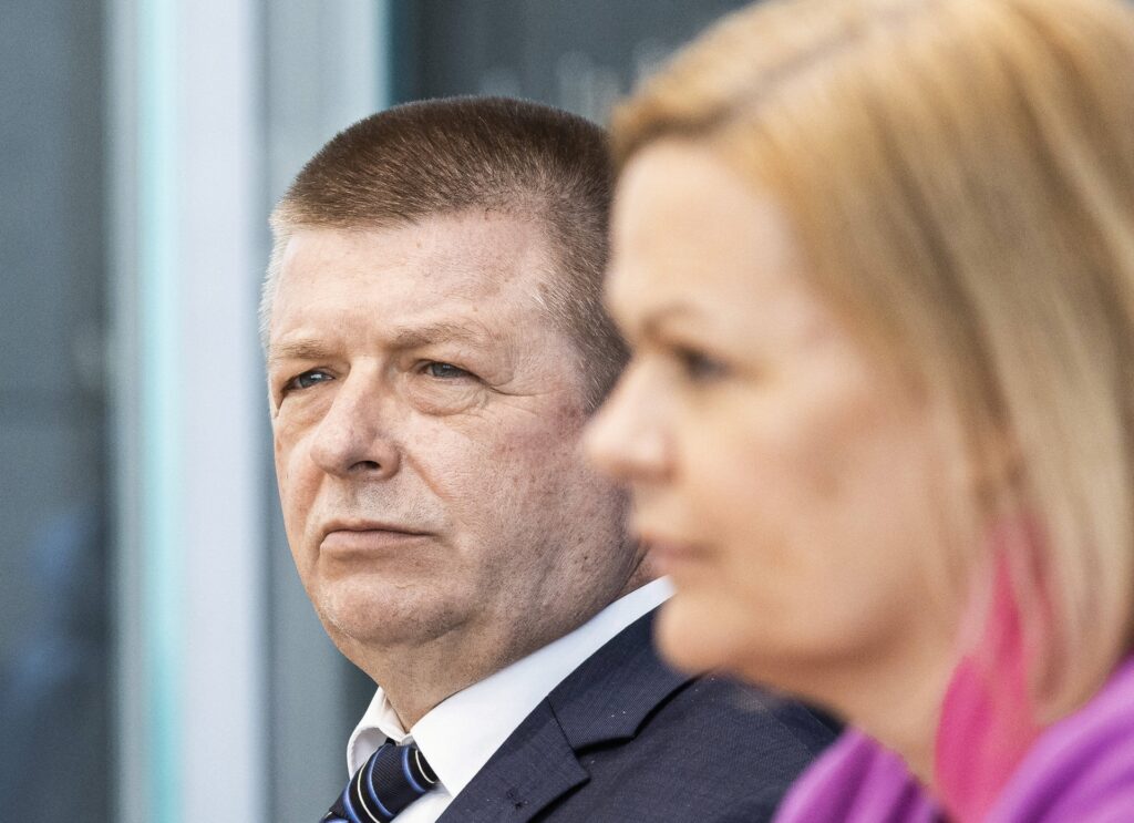 epa10000168 President of the German domestic intelligence service Thomas Haldenwang leaves a press conference after he presents the German Report on the Protection of the Constitution 2021, in Berlin, Germany, 07 June 2022