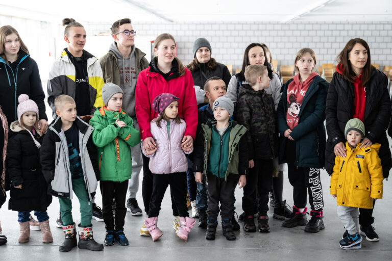 Ukrainische Kinder und Jugendliche sowie deren Betreuer sind im Internationalen Pfadizentrum angekommen, am Sonntag, 3