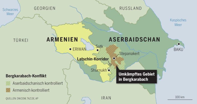 Der jahrhundertealte Konflikt zwischen Armenien und Aserbaidschan trat nach der Auflösung der Sowjetunion in seine jüngste Phase. Die beiden neuen Staaten waren bevölkerungsmässig nicht scharf getrennt. Wichtige Teile der armenischen Bevölkerung lebten in Aserbaidschan und umgekehrt. Besonders heikel war die Lage im Grenzgebiet Bergkarabach, das von einer grossen armenischen Mehrheit bewohnt, aber von Stalin der Gerichtsbarkeit der sozialistischen Republik Aserbaidschan unterstellt worden war. 1989 waren von den etwa 188 000 Menschen in Bergkarabach 73,5 Prozent armenischer Herkunft, 25,3 Prozent Aserbaidschaner. Während der Auflösung der Sowjetunion beanspruchte Armenien die Ko ...
