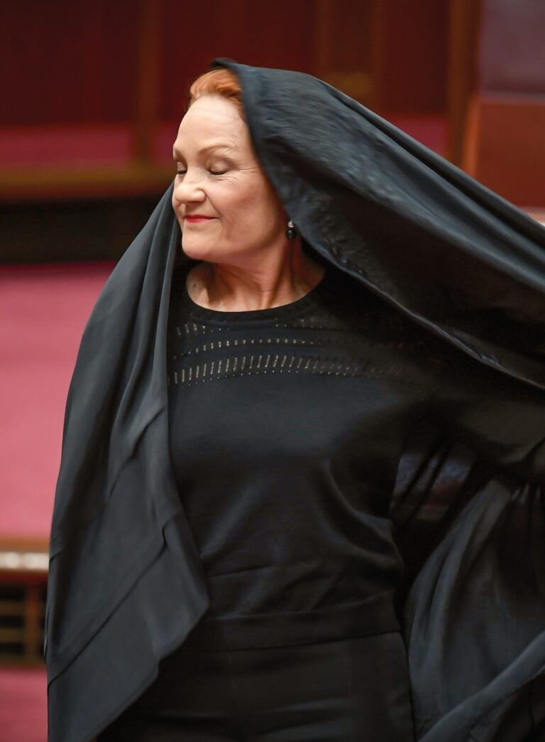 Pauline Hanson nimmt im Senat in Canberra eine Burka ab